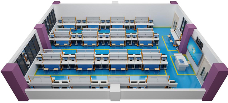 2、實訓桌桌面采用25mm麻灰色高密度層壓板封邊特制,有效提高絕緣等級;實驗桌底部裝有至少4個導向輪,方便實訓臺架移動;