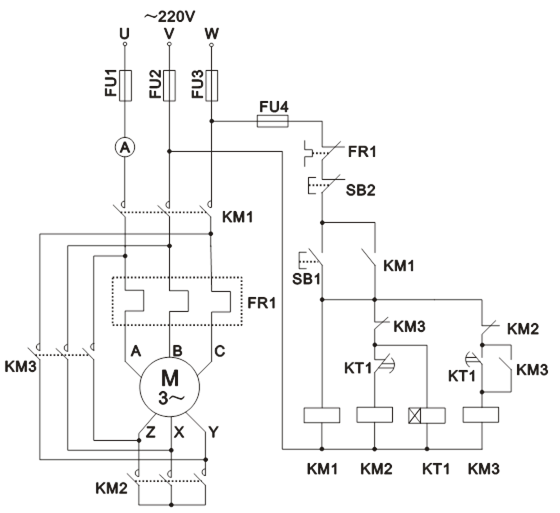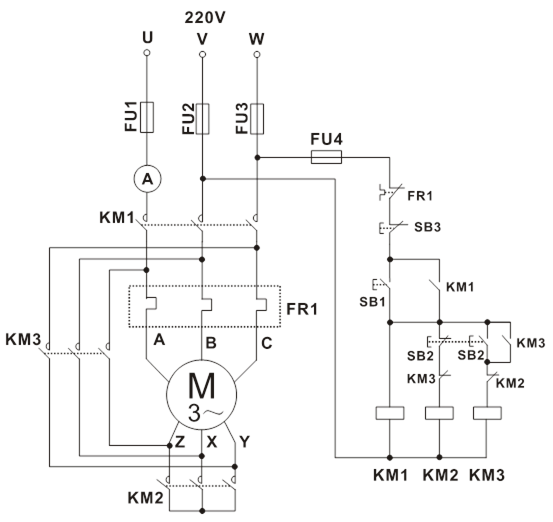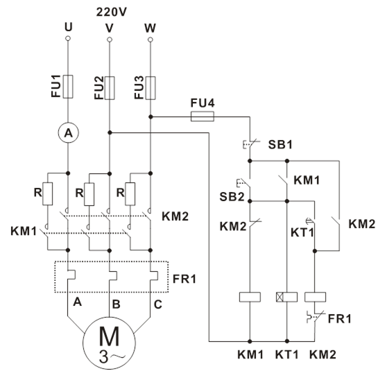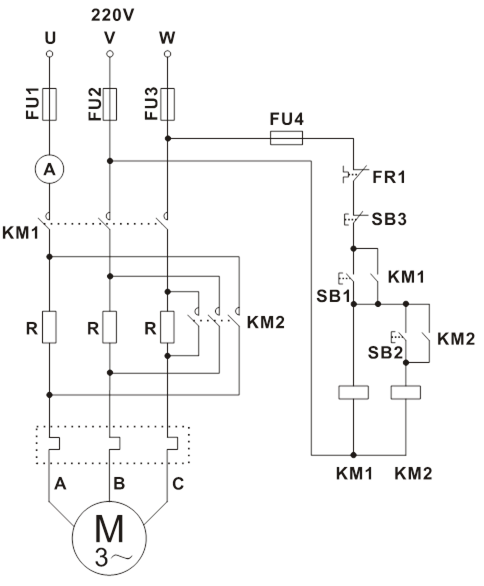 把三相可調(diào)電壓調(diào)至線電壓220V,按下屏上“停止”按鈕。按圖5-17接線。圖中SB1、SB2、SB3、KM1、KM2、FR1、FU1、FU2、FU3、FU4為掛件GDQ39-1上器件,R用DQ26上三組180Ω電阻,安培表用GDQ25上指針交流電流表,電機(jī)M選用DQ10(△/220V)。