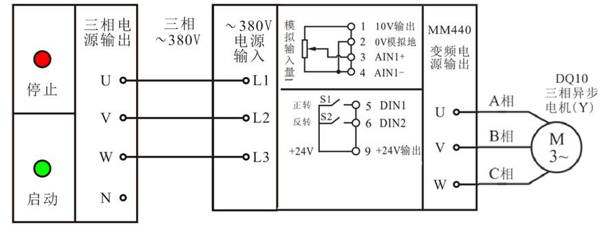 MM440變頻器的“1”、“2”輸出端為用戶的給定單元提供了一個(gè)高精度的+10V直流穩(wěn)壓電源。可利用轉(zhuǎn)速調(diào)節(jié)電位器串聯(lián)在電路中,調(diào)節(jié)電位器, 改變輸入端口AIN1+給定的模擬輸入電壓,變頻器的輸入量將緊緊跟蹤給定量的變化,從而平滑無(wú)極地調(diào)節(jié)電動(dòng)機(jī)轉(zhuǎn)速的大小。