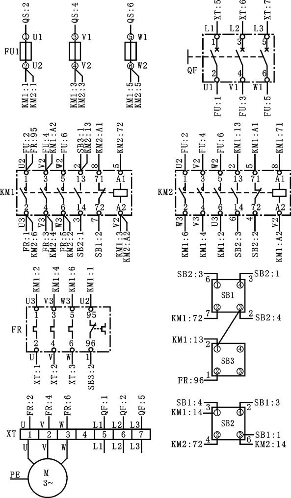 按布置圖器件的位置,在WD-21、WD-22掛板上選擇QF、FU、KM1、KM2、FR、SB1、SB3、SB2、XT等器件。圖5C(b)為用中斷線表示的單元接線圖,每個器件端子處接的線號及端子之間的連線圖上已明確示出。對接線和查線帶來很大方便。安裝與接線后,應(yīng)符合第二章的要求。