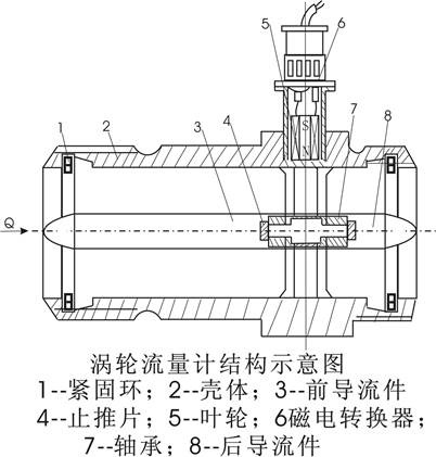 流量計主要由殼體、導流器、支承、渦輪和磁電轉換器組成,渦輪是測量元件,它由導磁系數(shù)較高的不銹鋼材料制成,軸芯上裝有數(shù)片呈螺旋形或直形的葉片,流體作用于葉片,使渦輪轉動。殼體和前后導流件由非導磁的不銹鋼材料制成,導流件對流體起導直作用。在導流件上裝有滾動軸承或滑動軸承,用來支撐轉動的渦輪。將渦輪轉速轉換為電信號的方法以磁電式轉換法應用最廣泛。磁電感應信號檢測器包括磁電轉換器和前置放大器,磁電轉換器由線圈和磁鋼組成,用于產(chǎn)生與葉片轉速成比例的電信號,前置放大器放大微弱電信號,使之便于遠傳。