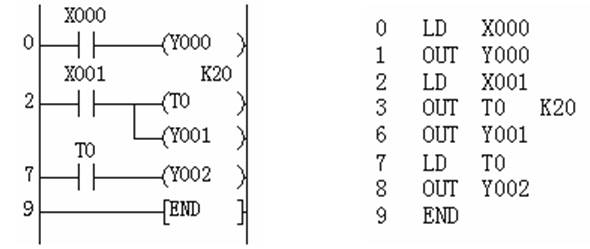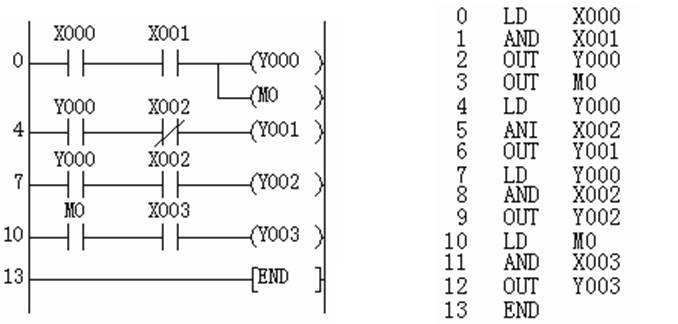 用AND、ANI指令可串聯(lián)連接1個觸點。串聯(lián)接點數(shù)量不受限制,該指令可多次使用。OUT指令后,通過觸點對其他線圈使用OUT指令,稱之為縱接輸出。(如下圖的OUTY000