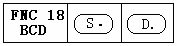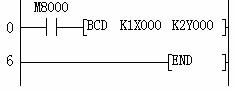 將源數(shù)據(jù)S(BIN)到目標(biāo)地址D(BCD)轉(zhuǎn)換傳送指令。如BCD轉(zhuǎn)換結(jié)果超出0~9999范圍會(huì)出錯(cuò)。在將可編程控制器內(nèi)的二進(jìn)制數(shù)據(jù)變?yōu)槠叨物@示等的BCD碼而向外部輸出時(shí)使用。