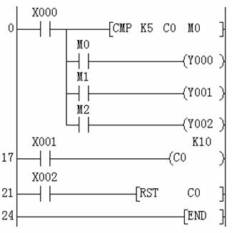 (4)例程說明:當(dāng)計(jì)數(shù)器C0的值:小于5時(shí),M0輸出ON;等于5時(shí),M1輸出ON;大于5時(shí),M2輸出ON。
