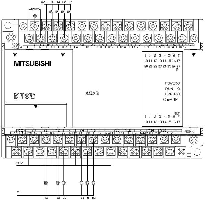 設計一個水塔水位控制程序,當水池水位低于低水位界L4時(L4=ON),閥M2打開進水;當水池水位高于高水位界時(L3=ON);則閥M2關閉;當水塔水位低于低水位界時(L2=ON),且水池水位高于低水位界;則抽水電機M1打開;當水塔水位高于高水位界時,則M1關閉;若在抽水過程中,水池水位下降到低水位界,則M1也關閉。