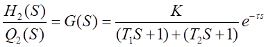 根據(jù)物料動(dòng)態(tài)平衡關(guān)系,并考慮到液體傳輸過(guò)程中的時(shí)延,其傳遞函數(shù)為: