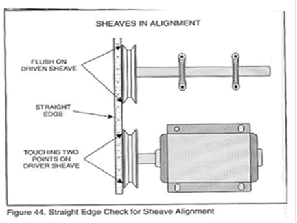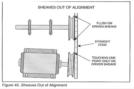 圖45所示。如果主動(dòng)帶輪沒有任何部分與米尺接觸上,則說明兩軸不平行或是帶輪未對(duì)準(zhǔn)。