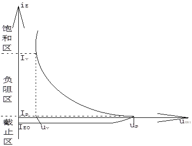 單結(jié)晶體管的特性曲線如圖2-2-14所示當(dāng)UBE1=0時,IE=IEO;當(dāng)UEB1增大至UP(峰點(diǎn)電壓時),PN結(jié)開始正向?qū),此時IE=IP(峰點(diǎn)電流);UEB1再增大一點(diǎn)管子就進(jìn)入負(fù)阻區(qū),隨著IE增大,UEB1減小,直至UEB1=UV(谷點(diǎn)電壓),IE=IV(谷點(diǎn)電流),UV取決于PN結(jié)的導(dǎo)通電壓和rb1 的飽和電阻rs;當(dāng)IE再增大,管子進(jìn)入飽和區(qū)。單結(jié)晶體管的三個區(qū)如圖2-2-14所標(biāo)注。