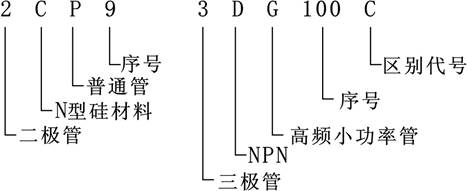 半導(dǎo)體器件的型號由五部分組成:第一部分用數(shù)字表示半導(dǎo)體管的電極數(shù);第二部分用拉丁字母表示半導(dǎo)體管的材料和極性;第三部分用拉丁字母表示半導(dǎo)體管的類別;第四部分用拉丁字母表示序號,第五部分用拉丁字母表示區(qū)別代號。半導(dǎo)體器件型號前三部分的含義見表7,半導(dǎo)體器件型號識別示例如圖2-2-9所示。