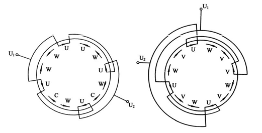 ② 用不同的顏色區(qū)分頭尾,且用 U1、V1、W1 標(biāo)明繞組的始端,U2、V2、W2 標(biāo)明繞組的末端。