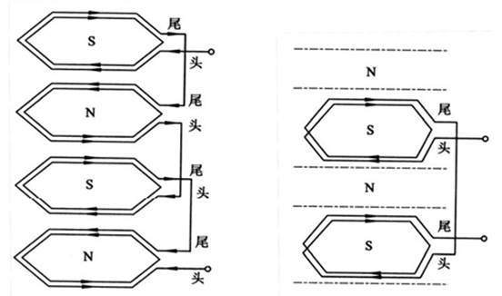 · 相繞組的連接。凡屬于同一相的極相組繞組,才能彼此連接,在一相繞組中,處于相鄰極下線圈的電流方向必須相反,即頭與頭、尾與尾連接。按順序連接完畢后,用箭頭標(biāo)出每個(gè)極相組的電流方向,其箭頭總是兩兩相對(duì),如圖 5-2 所示。