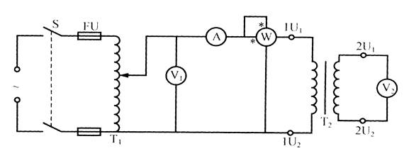 調(diào)壓變壓器一臺(tái),待測(cè)變壓器一臺(tái),交流電壓表兩只,交流電流表一只,低功率因數(shù)功率表一只,刀開(kāi)關(guān)一只,導(dǎo)線(xiàn)若干。