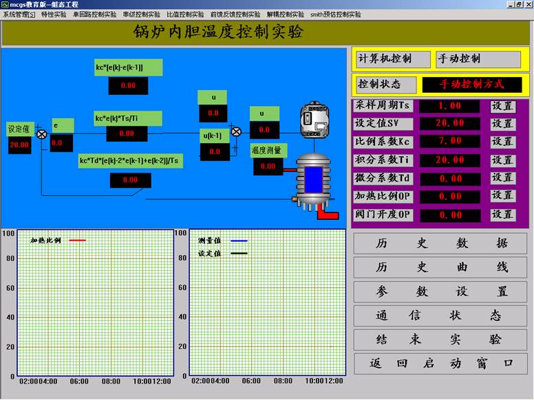 6.點(diǎn)擊“確認(rèn)”,用戶登錄完畢。選擇“單回路控制實(shí)驗(yàn)”下拉菜單中的“鍋爐內(nèi)膽溫度控制實(shí)驗(yàn)”。出現(xiàn)如下的“鍋爐內(nèi)膽溫度控制實(shí)驗(yàn)”界面。