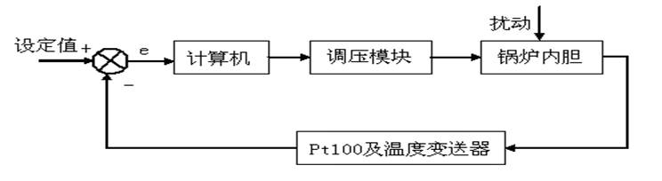 本實(shí)驗(yàn)采用計(jì)算機(jī)控制,將鍋爐的水溫控制在設(shè)定溫度。根據(jù)加熱器溫度變送輸出給計(jì)算機(jī),計(jì)算機(jī)根據(jù)PID運(yùn)算,然后控制輸出信號(hào)。通過(guò)調(diào)壓模塊,調(diào)整電加熱器的功率,使得鍋爐里水的溫度控制在設(shè)定的溫度。也可控制加熱器外層冷卻水的流量(溫度),控制鍋爐內(nèi)膽的水溫。