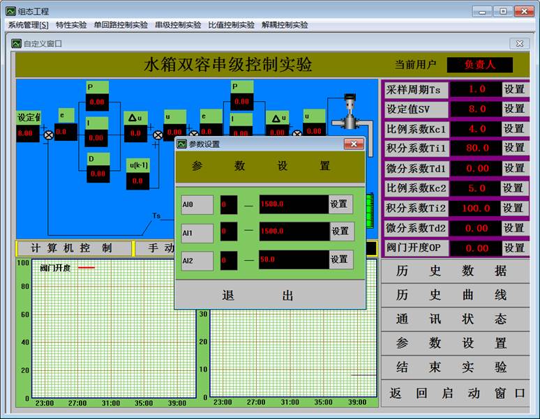 9.點(diǎn)擊“確認(rèn)”,用戶登錄完畢。選擇“串級控制實(shí)驗(yàn)”下拉菜單中的“雙容串級控制實(shí)驗(yàn)”。出現(xiàn)如下的“水箱雙容串級控制實(shí)驗(yàn)”界面。