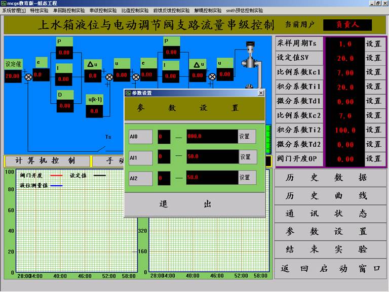 6.點(diǎn)擊“確認(rèn)”,用戶登錄完畢。選擇“串級控制實(shí)驗(yàn)”下拉菜單中的“上水箱液位與電動閥支路流量串級控制實(shí)驗(yàn)”,出現(xiàn)如下的“上水箱液位與電動閥支路流量串級控制實(shí)驗(yàn)”界面。