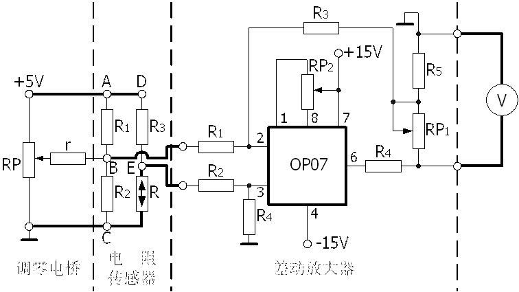 圖1-2 電阻式傳感器單臂電橋?qū)嶒炿娐穲D