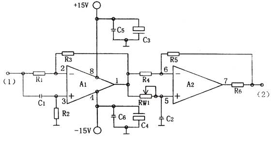 A1與C1、R2組成有源微分網(wǎng)絡(luò),A2與RW1、C2組成有源積分網(wǎng)絡(luò),當(dāng)①端輸入天弦交流信號μm時,A1輸出一超前μm相位信號,A2輸出一滯后μm相位的信號,通過調(diào)節(jié)RW1可使輸出信號與輸入信號相位發(fā)生變化。