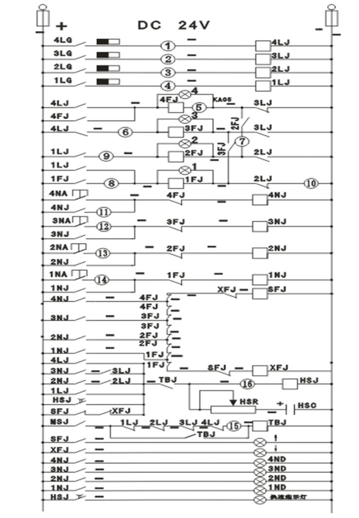在電梯井道內(nèi),每層都裝有一只永磁感應(yīng)器,而在轎廂側(cè)裝有一塊長(zhǎng)條的隔磁鐵板。假如電梯從1層向上運(yùn)行,則隔磁鐵板依次插入感應(yīng)器,當(dāng)隔磁板插入感應(yīng)器時(shí),該感應(yīng)器內(nèi)的干簧觸點(diǎn)閉合,控制相應(yīng)的樓層繼電器1LJ~4LJ吸合。