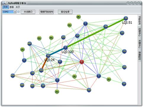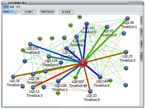 ZigBee 串口透傳模塊及配套方案是基于 IEEE 802.15.4/ZigBee 協(xié)議棧的 2.4G ZigBee 無線串口透明傳輸通信模塊。模塊采用十年來行業(yè)主流的 TI 高性能低功耗的 2.4G 射頻收發(fā)芯片 CC2530 及大功率低噪聲射頻前端芯片 CC2591,實現(xiàn)極易使用、全透明、高穩(wěn)定、超低功耗、超遠距離、超大規(guī)模 ZigBee 無線傳感網(wǎng)絡(luò)的組網(wǎng)。典型的 ZigBee 網(wǎng)絡(luò)如圖 1.1 與圖 1.2 所示。圖截取自我司可視化 ZigBee 實時控制調(diào)試工具。 ZigBee 網(wǎng)絡(luò)是一種小數(shù)據(jù)量的無線射頻網(wǎng)絡(luò),由非休眠的主機(CO)、路由(RO)與休眠的終端(EN) 節(jié)點構(gòu)成,圖中分別由紅、藍、綠色點表示。網(wǎng)絡(luò)有如下特點: