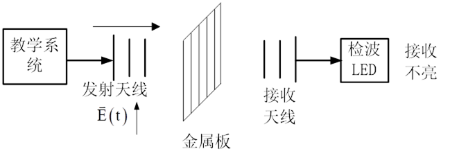 3)將垂直縫隙柵格平面金屬板放入收發(fā)天線中間,觀察LED燈是否被點(diǎn)亮。按下發(fā)射開關(guān),此時電磁波發(fā)射出來,觀察LED燈是否被點(diǎn)亮,因?yàn)椴粷M足邊界條件LED燈不亮。