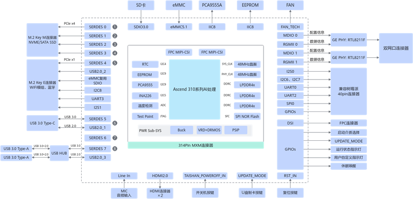 CPU :為 Ascend 310 AI 處理器,1個(gè)DaVinciV300 AI core(主頻500MHz),4個(gè)TAISHANV200M處理器核(主頻1.0GHz); 內(nèi)存:8GB LPDDR4X內(nèi)存,64bit位寬; 算力:半精度(FP16):4TFLOPS,整數(shù)精度(INT8):8TOPS; 存儲(chǔ):配備8GB LPDDR4X內(nèi)存,可外接最高256GB Micro SD; 核心擴(kuò)展: 40Pin擴(kuò)展接口:1個(gè); USB Type A接口:2個(gè); HDMI接口:2個(gè); USB Type C接口:1個(gè); Micro SD卡接口:1個(gè); MIPI-CSI連接器:2個(gè),8Lane; 風(fēng)扇接口:1個(gè); 千兆網(wǎng)口:1個(gè); |
