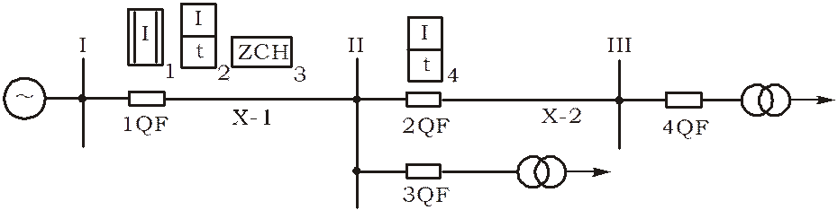 重合閘前加速保護(hù)的動(dòng)作原理可由圖19-1說明,線路X-1上裝有無選擇性的電流速斷保護(hù)1和過流保護(hù)2,線路X-2上裝有過流保護(hù)4,ZCH僅裝在靠近電源的線路X-1上。無選擇性電流速斷保護(hù)1的動(dòng)作電流,按線路末端短路時(shí)的短路電流來整定,動(dòng)作不帶延時(shí)。過流保護(hù)2、4的動(dòng)作時(shí)限按階梯原則整定,即t2>t4。