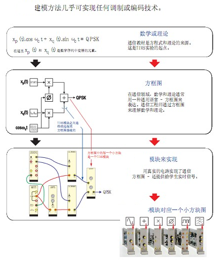 根據(jù)原理框圖,利用基本功能模塊的組合進(jìn)行功能設(shè)計,可以完成各個實驗中所需的信號的產(chǎn)生和信號處理等來很好地詮釋相應(yīng)的實驗原理。顛覆了現(xiàn)在市場上通用驗證型實驗箱的設(shè)計思路,真正的設(shè)計型實驗系統(tǒng)。通過實驗真正對原理的學(xué)習(xí)起到促進(jìn)作用。 意義一:按照"一個方框圖=一個模塊"的設(shè)計,可把復(fù)雜的系統(tǒng)方框圖通過模塊組合來實現(xiàn),加深對通信系統(tǒng)原理的學(xué)習(xí)。