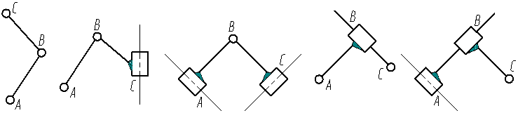 最簡單的桿組為n = 2, P5 = 3,稱為Ⅱ級組,由于桿組中轉(zhuǎn)動副和移動副的配置不同,Ⅱ級桿組共有如下五種形式: