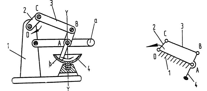 圖1-2a所示為攪拌機(jī)Ⅱ的結(jié)構(gòu)示意圖,1-2b是攪拌機(jī)構(gòu)的運(yùn)動(dòng)簡(jiǎn)圖。鉸鏈四桿機(jī)構(gòu)DCBA的搖桿4繞軸線A轉(zhuǎn)動(dòng),搖桿4既為漿葉。軸線A實(shí)際上是搖桿4與機(jī)架1形成的轉(zhuǎn)動(dòng)副。重物a用以漿液壓向碗底。在曲柄2轉(zhuǎn)動(dòng)時(shí),漿液4沿碗底b滑動(dòng);碗底做成中心在A點(diǎn)的球形表面。碗繞鉛垂軸線Y-Y轉(zhuǎn)動(dòng),其傳動(dòng)裝置在圖中未畫出。