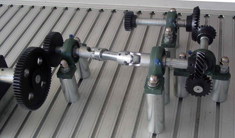 7、選折合適的位置搭建斜齒輪傳動系統(tǒng);選折長短合適的軸承支撐架和斜齒輪的傳動軸、按照前面的實驗搭建。將一對斜齒輪分別緊固在兩傳動軸上,移動軸承支架對齊兩斜齒輪。如果高度不合適可墊墊圈調(diào)整。按照校準(zhǔn)直齒圓柱齒輪的方法來校準(zhǔn)此傳動系統(tǒng),保證兩軸線成90度;