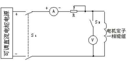 按圖3-1接線。把R調(diào)至最大位置,合上開(kāi)關(guān)S1,調(diào)節(jié)直流電源輸出電壓及R阻值使試驗(yàn)電流不超過(guò)電機(jī)額定電流的20%,以防因試驗(yàn)電流過(guò)大而引起繞組的溫度上升,讀取電流值,再接通開(kāi)關(guān)S2讀取電壓值。讀完后,先斷開(kāi)開(kāi)關(guān)S2,再斷開(kāi)開(kāi)關(guān)S1。