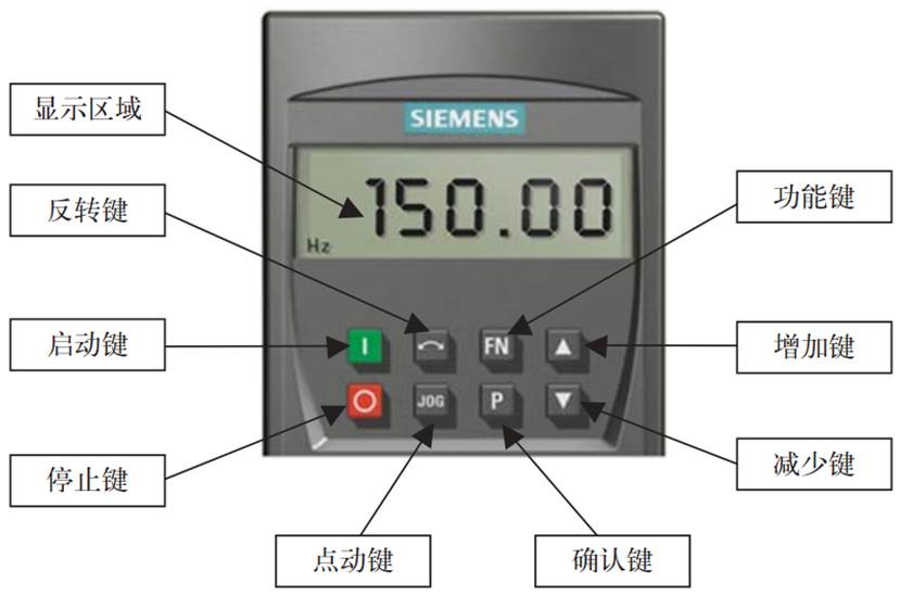 利用變頻器的操作面板和相關參數(shù)設置,即可實現(xiàn)對變頻器的某些基本操作如正反轉、點動等運行。變頻器面板的介紹及按鍵功能說明如下圖,具體參數(shù)號和相應功能參照系統(tǒng)手冊。