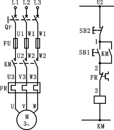 確認(rèn)接線正確后,接通交流電源L1、L2、L3并“合”開關(guān)QF,按下SB1,電機(jī)應(yīng)起動并連續(xù)轉(zhuǎn)動,按下SB2電機(jī)應(yīng)停轉(zhuǎn)。若按下SB1電機(jī)起動運(yùn)轉(zhuǎn)后,電源電壓降到320V以下或電源斷電,則接觸器KM的主觸頭會斷開,電機(jī)停轉(zhuǎn)。再次恢復(fù)電壓為380V(允許±10%波動),電機(jī)應(yīng)不會自行起動——具有欠壓或失壓保護(hù)。