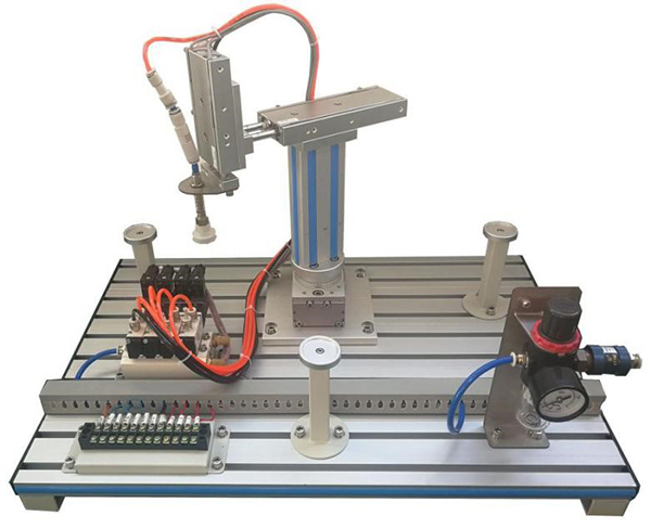 模型由回轉(zhuǎn)氣缸、雙軸氣缸、單軸氣缸、吸盤、真空發(fā)生器、電磁閥、節(jié)流閥、手滑閥、減壓閥、磁性開關(guān)、機械部件、工業(yè)鋁合金型材底板等組成,設(shè)有兩個抓取工位,可進行工件取放控制練習?砷_展對氣動機械手的操作及編程控制訓練。配有空氣壓縮機:靜音無油,工作電源AC220V±10% 50Hz,輸入功率0.68kW;公稱容積24L,理論流量:116L/min,額定輸出氣壓0.7MPa。