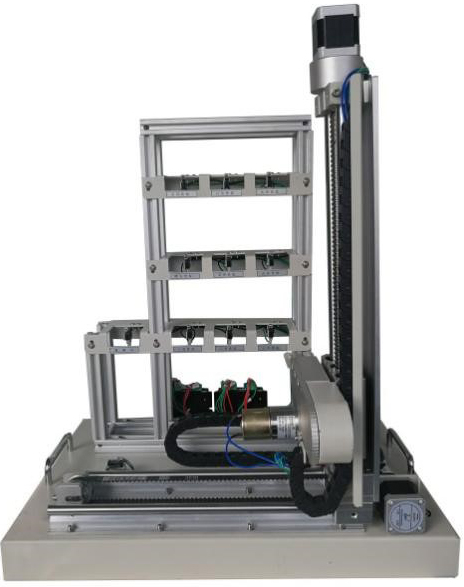 1.17 | 立體倉庫控制系統(tǒng) | 模型包含三層九倉位庫體、出/入庫倉位庫體、三維(X、Y、Z)運動機械及電氣控制等部分組成;定位執(zhí)行機構(gòu)由豎軸和橫軸組成;驅(qū)動機構(gòu)由步進電機及步進電機驅(qū)動器組成;傳動軸為滾珠絲桿傳動和雙軸導軌帶傳動,傳動平穩(wěn)。取物軸由直流減速電機驅(qū)動,可實現(xiàn)前后兩方向的運動。 |