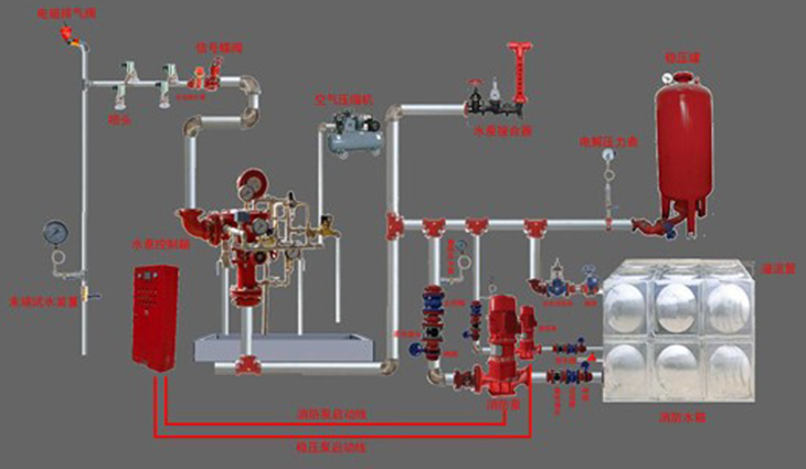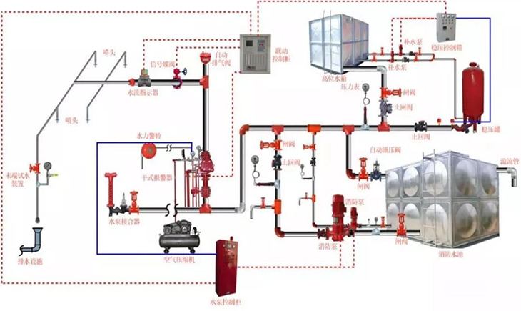 干式系統(tǒng)的基本構(gòu)成條件包括水源、加壓與穩(wěn)壓設(shè)施、壓力氣源、報(bào)警裝置、管網(wǎng)及閉式噴頭等部分。