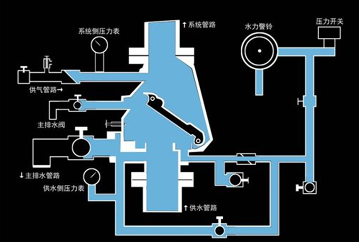 當(dāng)系統(tǒng)處于伺應(yīng)狀態(tài)時(shí),座圈上的溝槽小孔被閥瓣蓋住封閉,通往水力警鈴的報(bào)警水道被堵死;當(dāng)上、下壓力差達(dá)到一定數(shù)值,閥瓣才開(kāi)啟(差壓?jiǎn)?dòng)),水就從供水側(cè)流向系統(tǒng)側(cè),警鈴報(bào)警,滅水系統(tǒng)噴水;當(dāng)上、下壓力頻繁開(kāi)啟,在閥瓣上設(shè)有小補(bǔ)水閥,當(dāng)系統(tǒng)側(cè)管網(wǎng)有微小滲漏或水源壓力有波動(dòng)時(shí),可以通過(guò)補(bǔ)水閥給管網(wǎng)補(bǔ)水,平衡上、下腔壓力,穩(wěn)定了閥瓣,從而避免了誤報(bào)警。