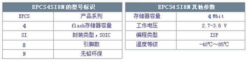 FPGA配置芯片EPCS4板上使用的配置芯片為Altera公司生產(chǎn)的串行主動配置芯片EPCS4S08。Altera公司的串行配置器件是業(yè)界最低價格的配置器件。性能包括在系統(tǒng)編程(ISP)能力和多次編程能力,這種新型串行配置器件作為Cyclone™FPGA器件在大容量低價格應(yīng)用領(lǐng)域的完美補充,使得FPGA和配置器件相結(jié)合,提供一種盡可能最低價格的完整的可編程片上系統(tǒng)(SOPC)解決方案。EPCS4SI8N器件的型號標(biāo)識與參數(shù)如表2-4所示: