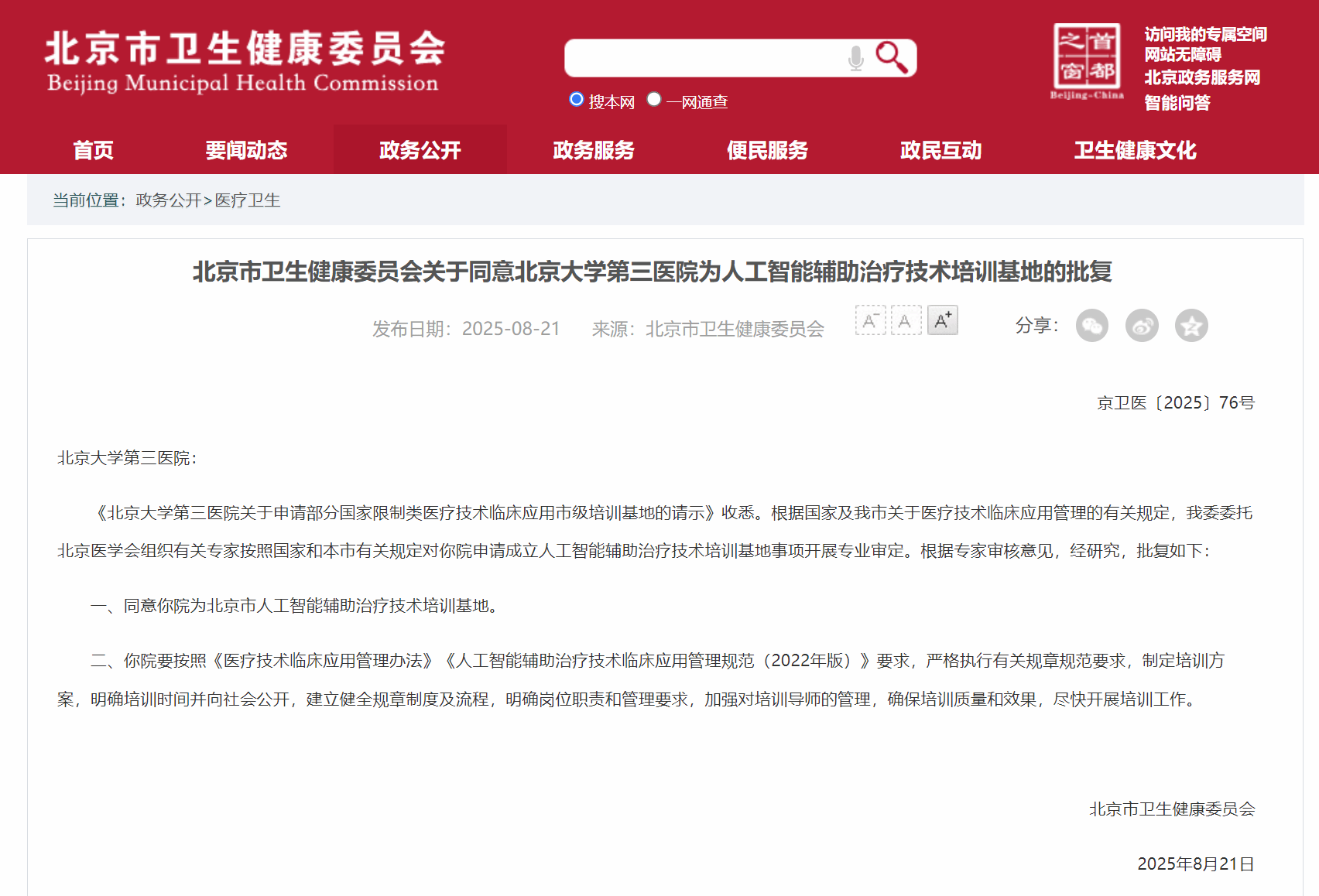 2025年8月21日,北京市衛(wèi)生健康委正式批復(fù),同意北京大學(xué)第三醫(yī)院為北京市人工智能輔助治療技術(shù)培訓(xùn)基地。該基地的獲批標志著北京大學(xué)第三醫(yī)院在智能外科領(lǐng)域的技術(shù)實力與教學(xué)能力獲得認可,將為北京市乃至全國培養(yǎng)高素質(zhì)的醫(yī)療人工智能應(yīng)用人才提供重要平臺。