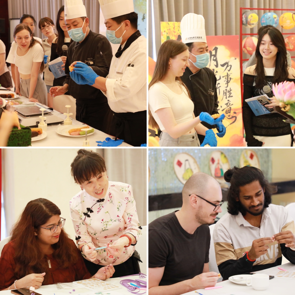 9月30日下午,中關(guān)新園1號樓集賢多功能廳內(nèi)暖意融融,月餅DIY課堂溫馨開課。留學(xué)生們在廚師團隊的指導(dǎo)下,揉制面團、包裹餡料、壓制成型,親手制作出一枚枚紋樣清晰、飽滿圓潤的月餅,節(jié)日甜香彌漫全場。
